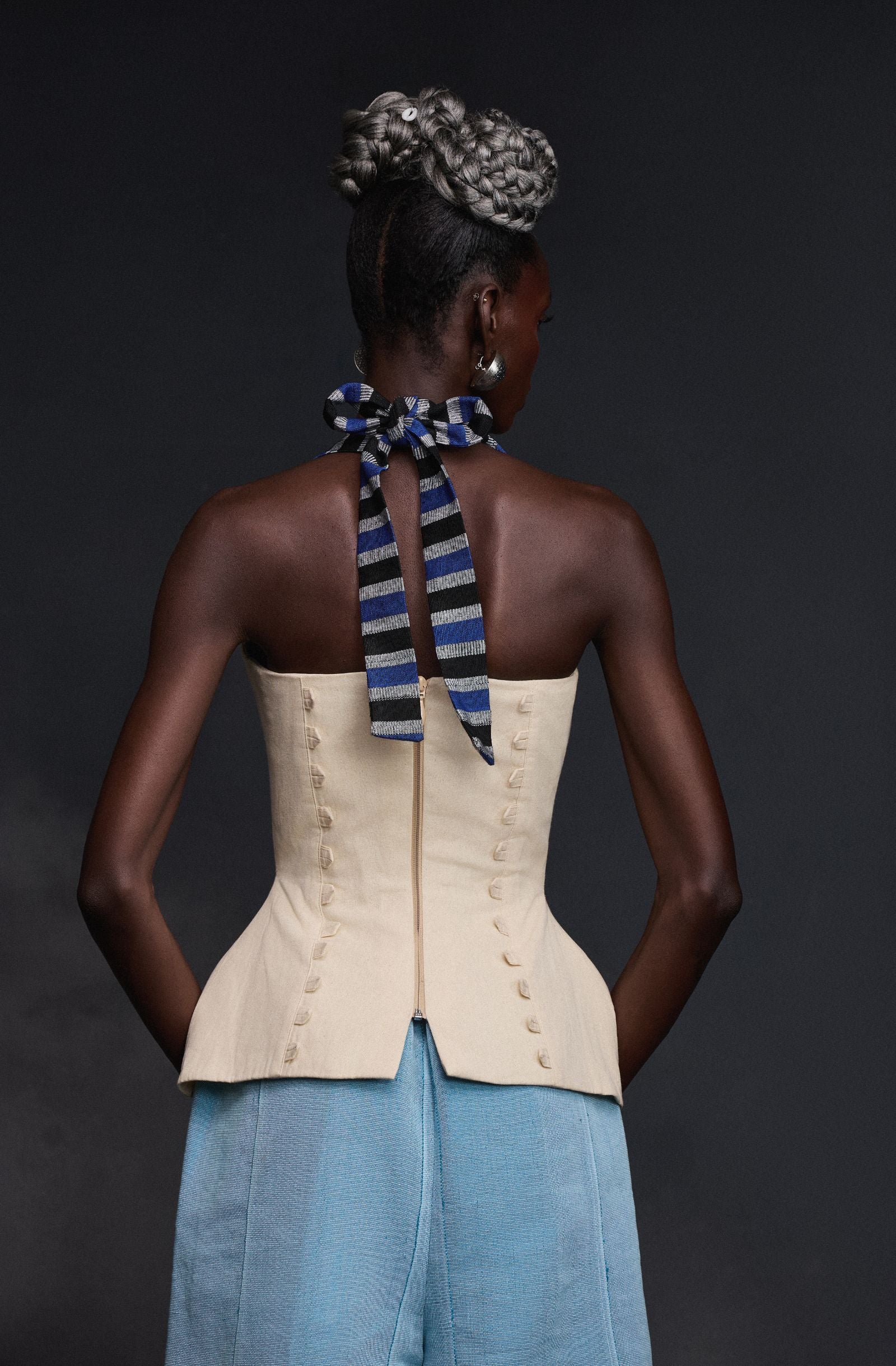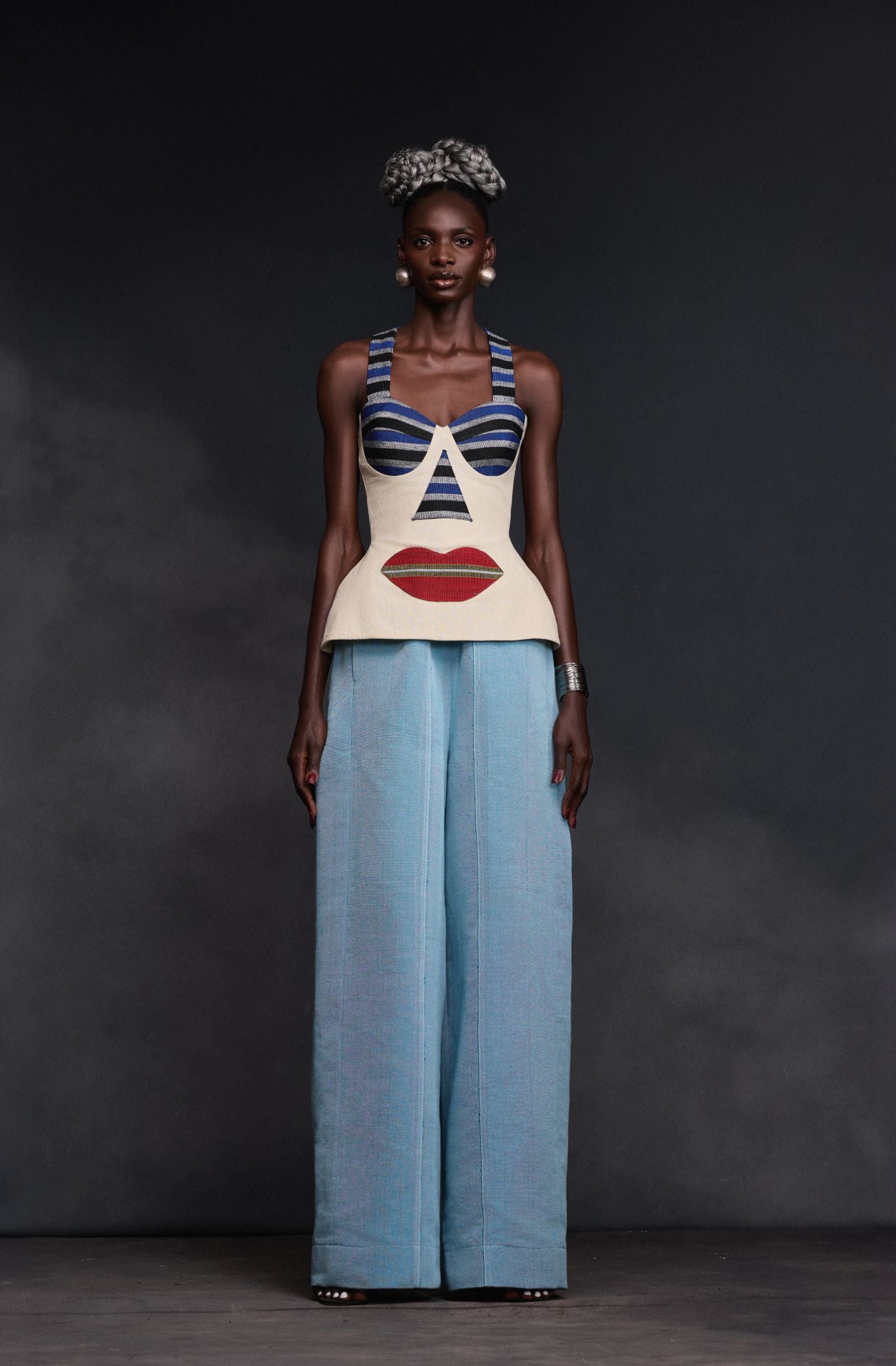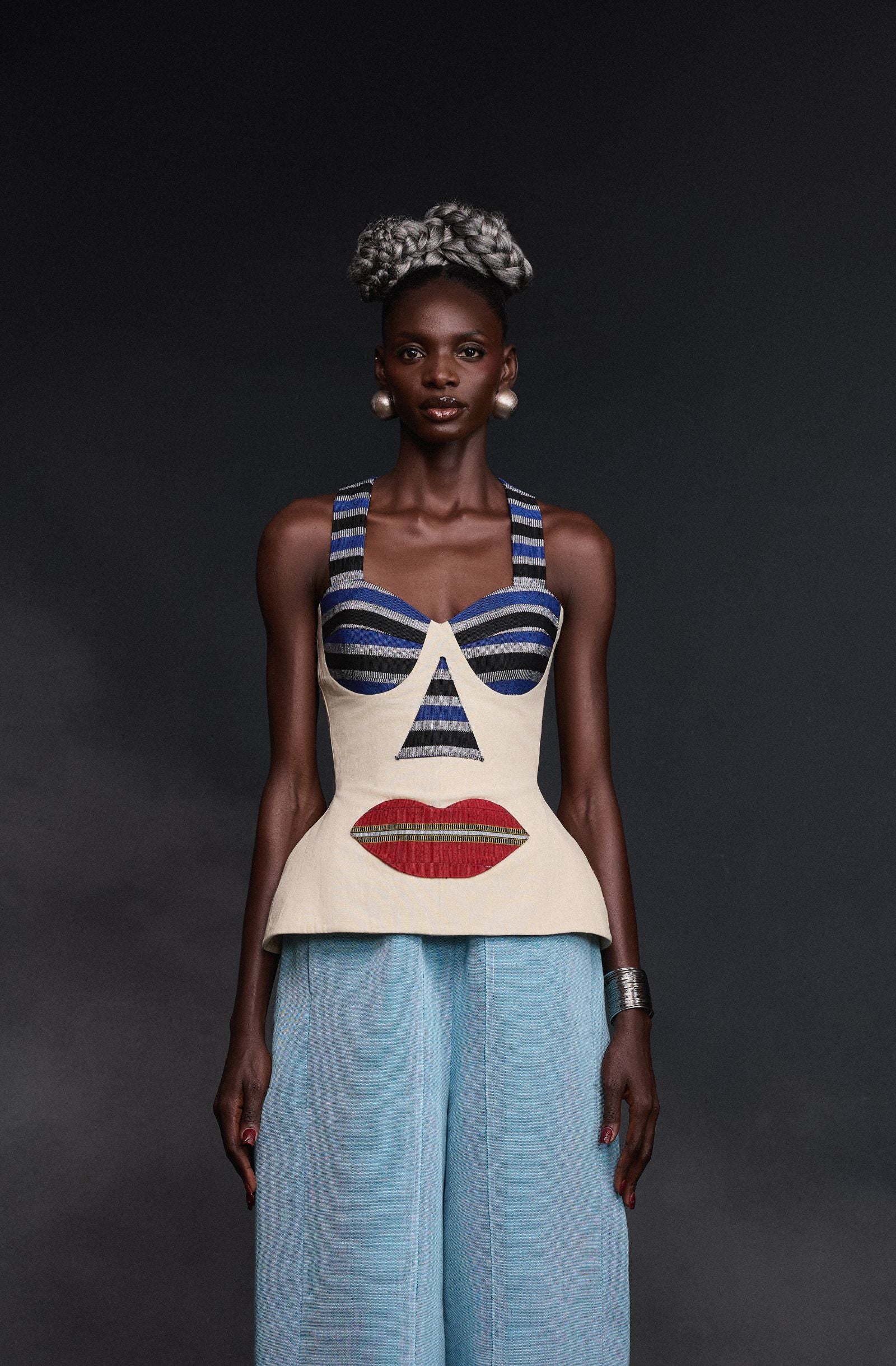 Paired with the sleek and tailored Jerry Pants, the ensemble strikes the perfect balance between playful expression and refined elegance. While the Dona Top draws attention with its face-inspired structure, the Jerry Pants ground the look with clean lines and modern sophistication.