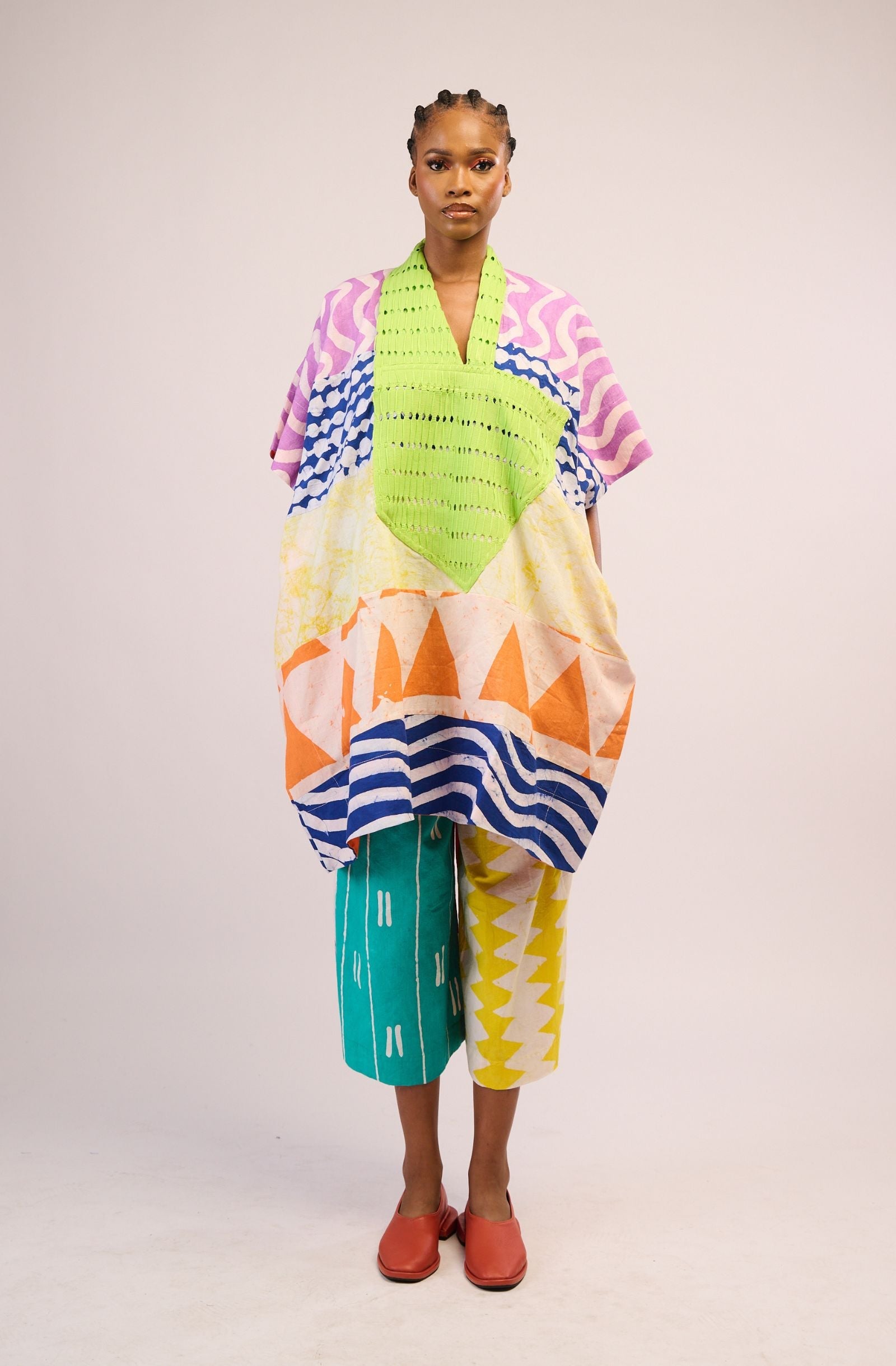 Our signature Agbada is reimagined in a mini size in a multicolour multi-print option - pair with shorts and pants, or wear on its own.